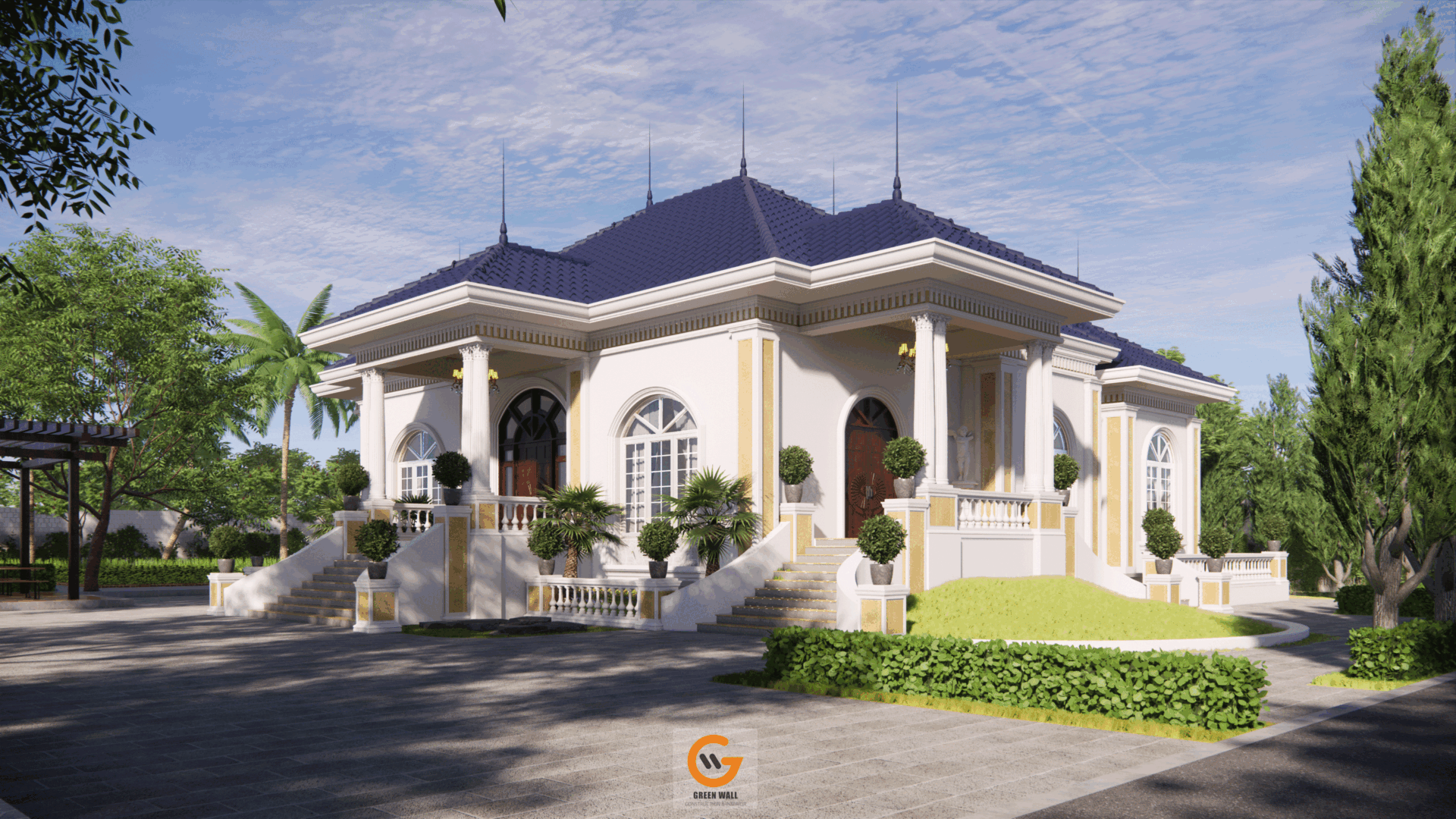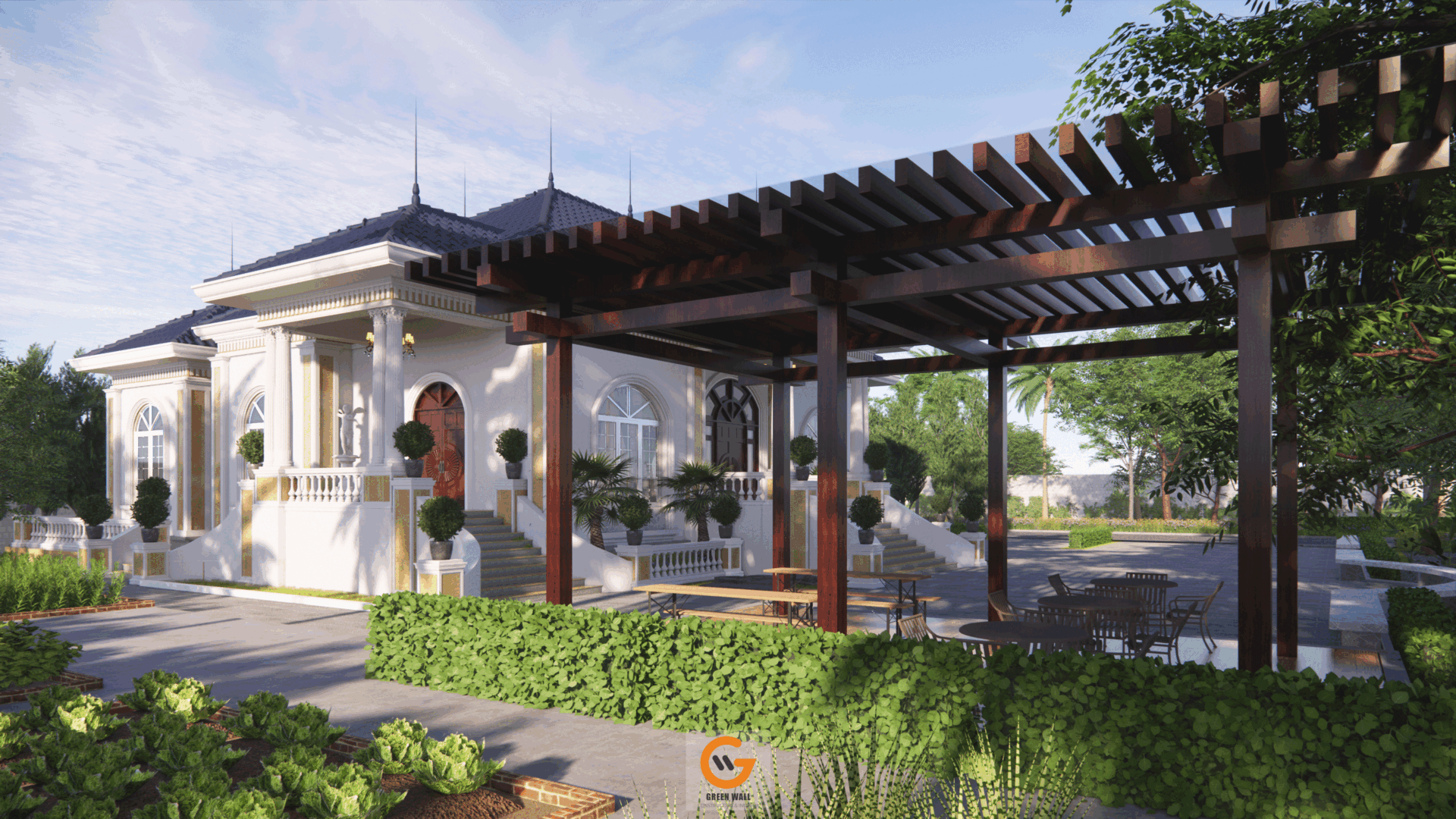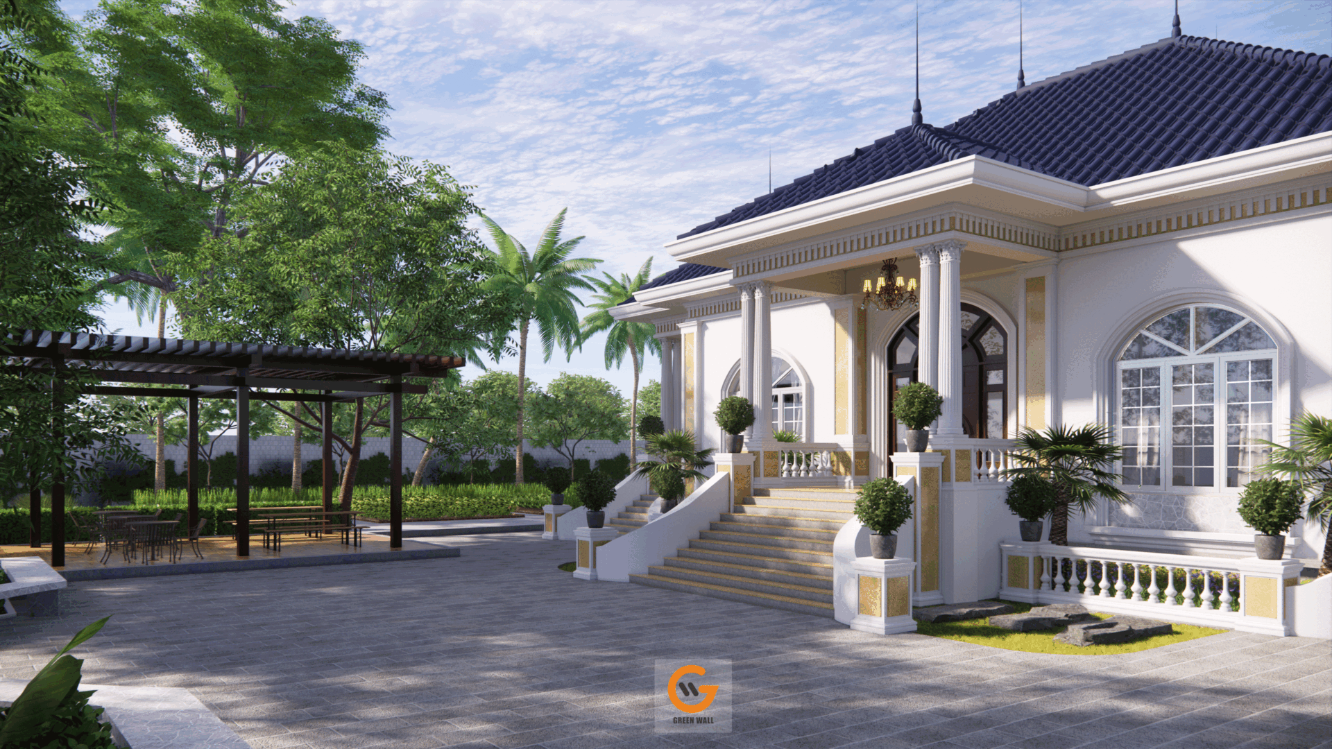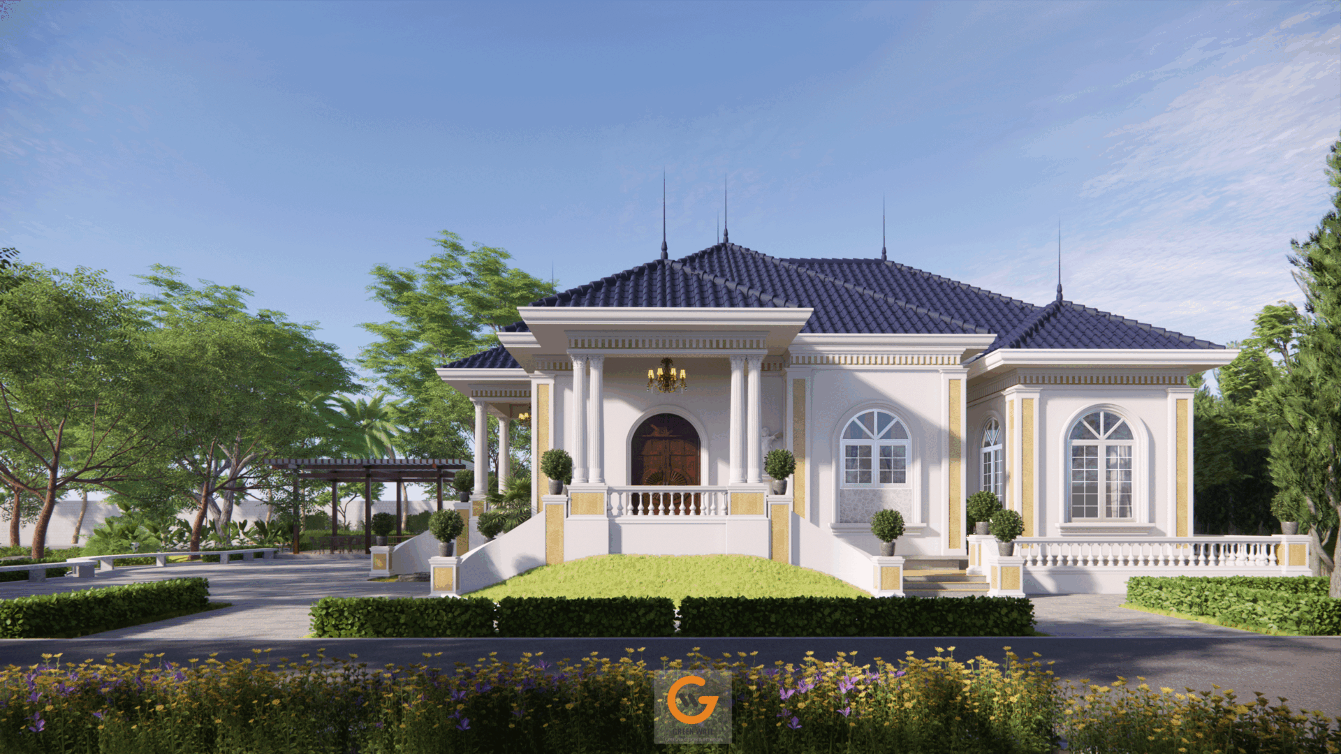 Giữa khu vườn xanh mát, ngôi biệt thự hiện lên thanh lịch và bề thế với thiết kế mái Thái ấn tượng, kết hợp cùng đường nét kiến trúc cổ điển tinh tế. Đây không chỉ là một ngôi nhà, mà là nơi đánh thức mọi giác quan – một chốn đi về lý tưởng, nơi thiên nhiên và kiến trúc hòa làm một.